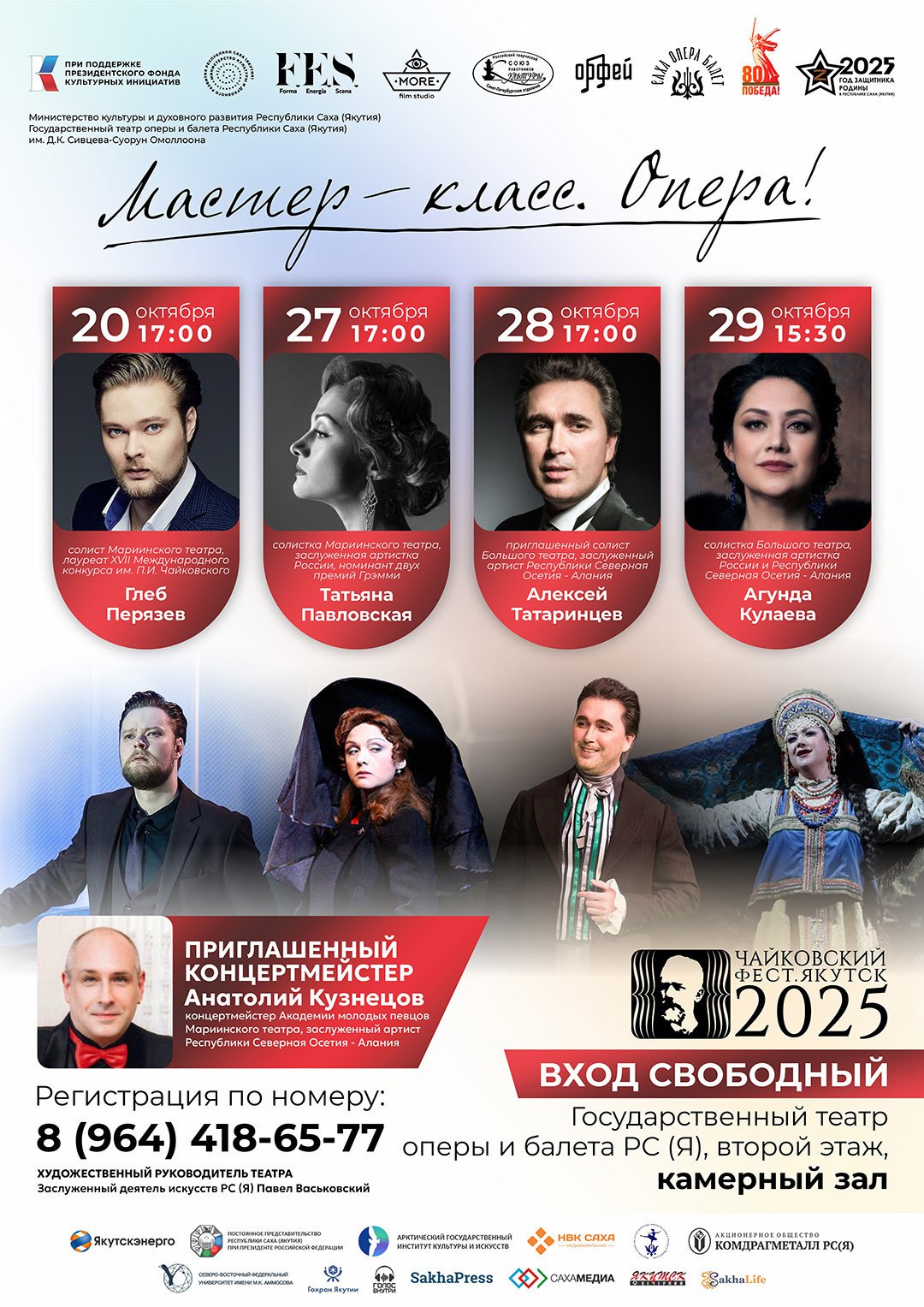 - Тематика: «Искусство вокалиста в опере», «Оперы Чайковского», работа над верхним регистром и опорой